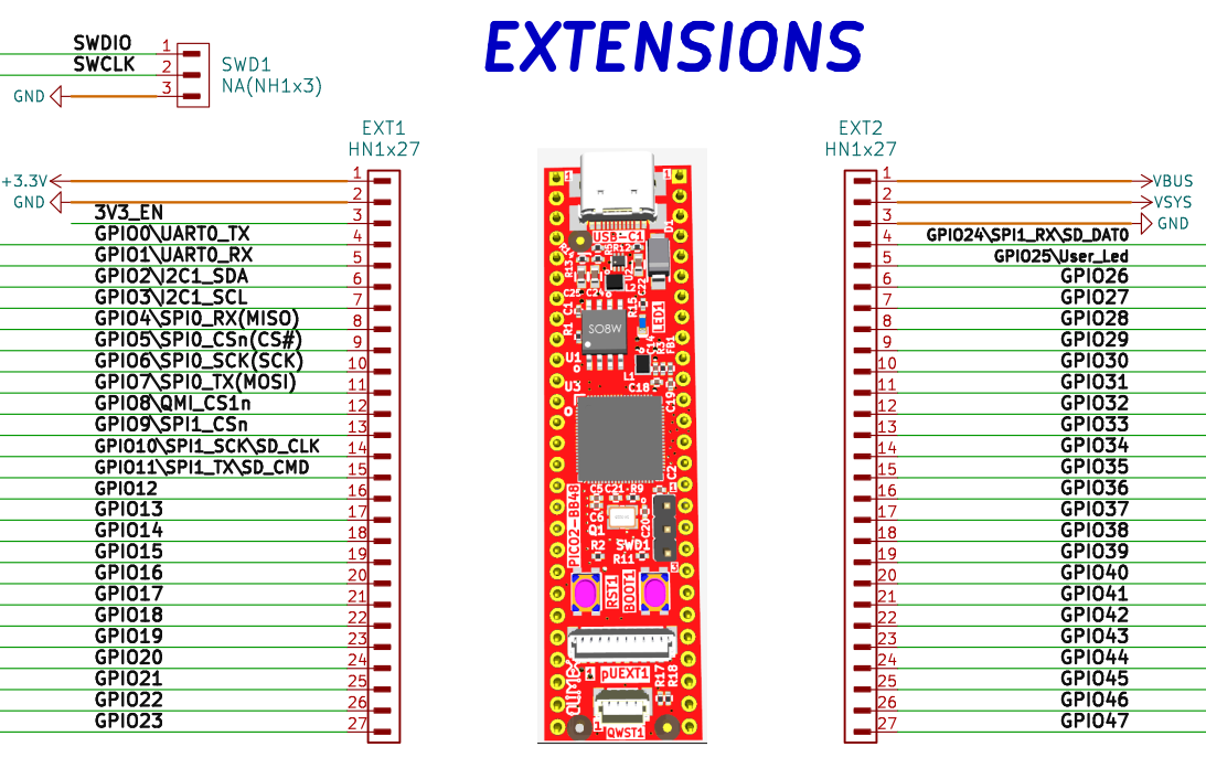 - RP2350B Dual Cortex-M33 or dual RISC-V @ 150MHz
